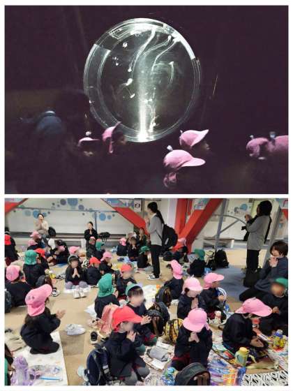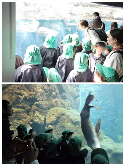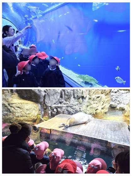 アザラシの食事風景や水中から突然飛びあがってイカダに寝そべる姿も見ることができました。イルカや大水槽で泳ぐジンベイザメやエイ、魚の群れ等に驚いたり、暗闇に輝くクラゲを不思議そうに見たりしていました。