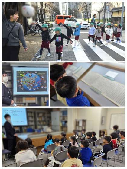 適塾では、入るとすぐに柱についた刀の跡を探したり「ここで勉強してたのかな」と話たりして、当時を想像しながら見学していました。「適塾って幼稚園と似てるなぁ」と建物に関心ももっていました。2階にあがると園にいるあか組もも組が見え、大喜びで手を振っていました。