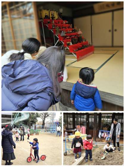 園庭からは、和室に飾っている雛人形を保護者の方と一緒に珍しそう眺めているました。