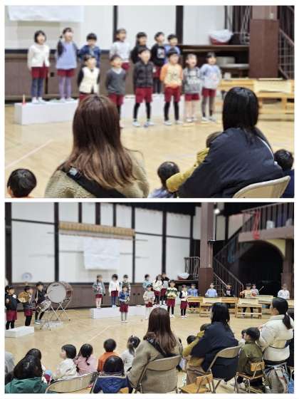 後半、みどり組ともも組が生活発表会で楽しんだ演技を見せてくれました。初めて見る歌と合奏、劇遊びに興味津々!驚き、喜び見ていました。