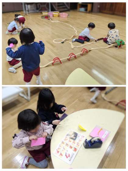 室内では、今日はどんな道にしようかな?と考えながら線路を組み立てて電車を走らせたり、折紙に夢中の子どももいます。