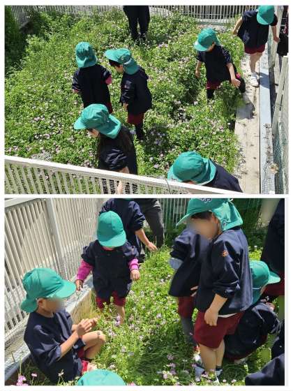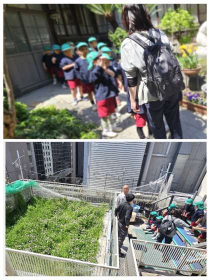 早めにお弁当を食べ終えたみどり組、緒方ビルの屋上にレンゲ摘みに出発です。地域の方から「今年はレンゲが沢山咲いてるよ」とお知らせをもらい、早速出かけることにしました。
