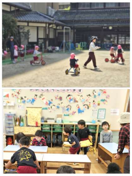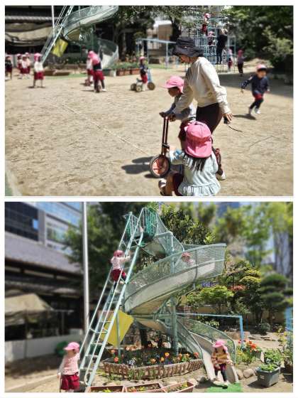 3歳児が帰ったあとは、4歳児もも組の子どもたちが園庭を駆けまわっていました。好きな遊びを見つけて存分に遊びを楽しんでいました。