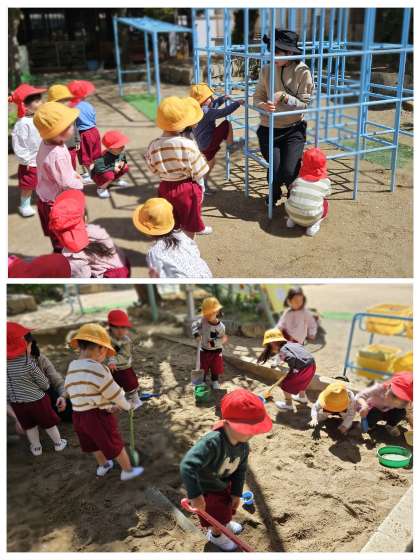 この日は砂場が大人気でした。好きな遊具をもって、砂を掘ったり、型に入れたりしていました。ウサギのびょんちゃんの様子を見に行く子どももいました。