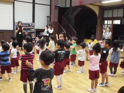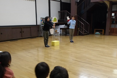 途中で、マスコットのウサギのあいちゃんが幼稚園の仲間の紹介に来てくれました。毎回来てくれますよ。みんなで体を動かすことも楽しみます。