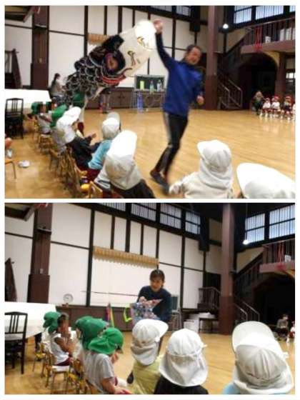 子どもたちが元気いっぱい過ごせるよう願いを込めて、こいのぼりがあがります。いつもは園庭のお空を泳いでいるこいのぼりが遊戯室にあがり、間近で見る迫力に「わぁ、おおきい」と歓声があがっていました。