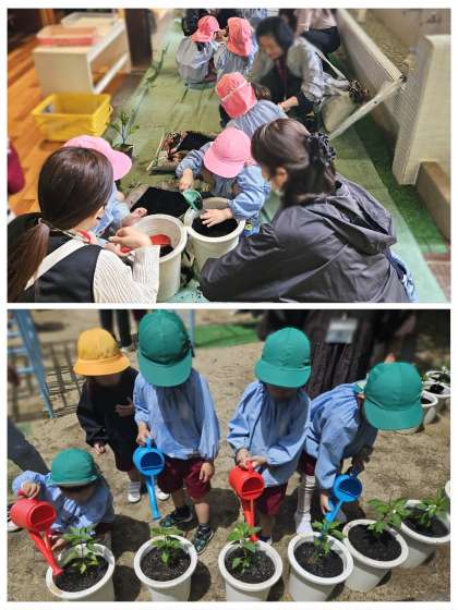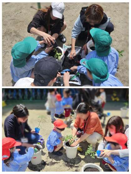 ゴールデンウィーク明け、全クラスの子どもたちは保護者と一緒に夏野菜の苗植えをしました。これまでの経験をいかして慣れた手つきで苗植えをするみどり組の子どもと保護者の方、さすがでした。
