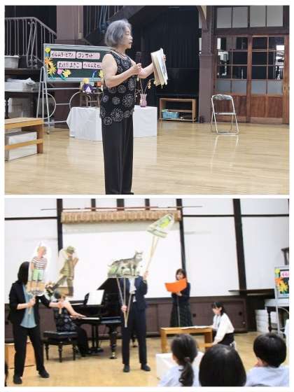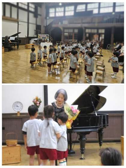5月19日、春のイルムラーピアノコンサートを開催しました。本園修了でドイツ在住のピアニストの武田牧子ヘルムス先生が、帰国の折にはいつも子どもたちに素敵な演奏をしてくださいます。今回はロシアの交響的物語「ピーターと狼」を演奏してくださいました。園の先生たちも演奏やとナレーションに合わせてペープサートでコンサートを盛りあげます。登場人物や物語の展開で曲想がかわり、子どもたちは「オオカミの音が怖かった」「楽しかった」とピアノ演奏と登場人物の掛け合いを楽しんでいました。