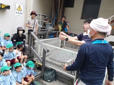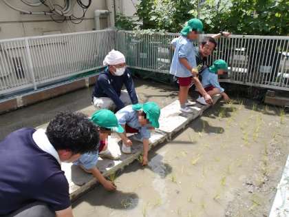 みどり組が田植えをしました。毎年、地域の川上様のご厚意で緒方ビルの屋上で米作り体験をしています。田植え以降も稲刈り、脱穀や精米までの体験ができるようにと田んぼを大切に管理してくださいます。