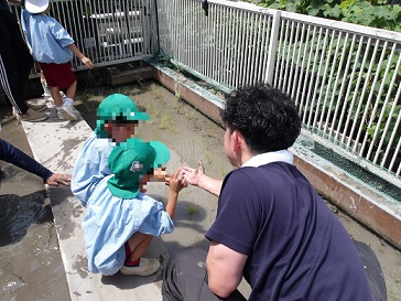 4月、田んぼに遊びに行きレンゲ草を摘んだ頃と景色は大違いです。「本物の田んぼや」と驚いていました。苗の持ち方と植え方を分かりやすく教えていただき、田んぼの中で元気に泳ぐカブトエビも間近で見たり触れたりさせていただきました。