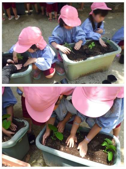 種をまき、毎日水やりをして芽がのびてきたゴーヤとアサガオ。本葉も出てきたので大きなプランターに引っ越しをしました。この日はもも組がゴーヤもアサガオどちらも植え替えてくれました。深く穴を掘り、苗を傷つけないように大事そうにふわっと土をかぶせていました。