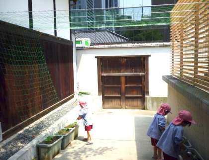 アサガオはみどり組がお世話をしてきました。アサガオが伸びきらないうちに「もも組さんでお引越ししてあげよう」とがんばっていました。