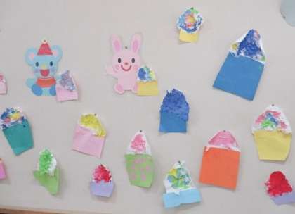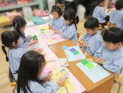 「織姫さまと彦星さまやねん」と、七夕のお話のイメージを広げて2人の顔を丁寧にかいていました。コーヒーフィルターはにじんだ色が素敵な着物に変身!こよりをつけて七夕飾りにするそうです。四角つなぎは折り紙の色を考えながらつなげていました。