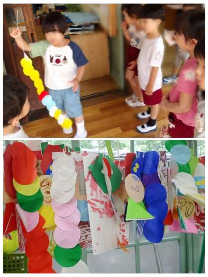 指に少しだけつけたのりを、折り紙にのばして1枚1枚貼り合わせて七夕飾りをつくっています。長くつなげられたことが嬉しくて他のクラスの友達にも見せていました。のりの使い方は遊びながら分かってきてました。かいたり貼ったりしてかわいい笹飾りが沢山できてきました。