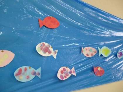 好きな入れを選んでギュー、ポン!とタンポをしっかり押すこともできるようになってきました。水の中で気持ち良さそうに泳ぐ色とりどりの魚たち、丸い模様がかわいいですね。