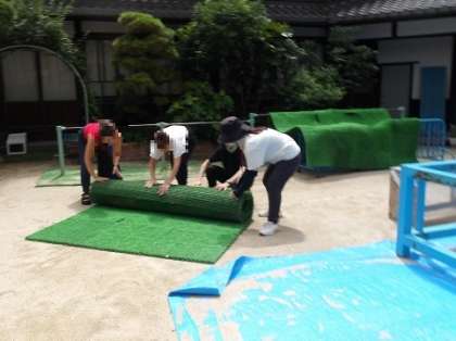 骨組みの解体、人工芝の片付け、プール本体のパウダー塗布、浮き輪やビニールプールの空気ぬき等、分担して手際よく進めてくださいました。