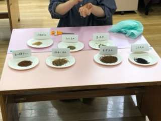 保育室に戻ると、いろいろな種類のお茶っぱを用意して違いを見つけました。