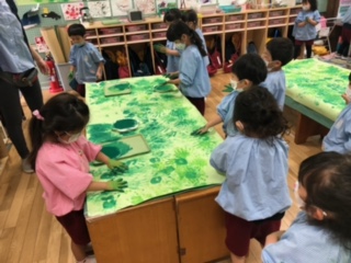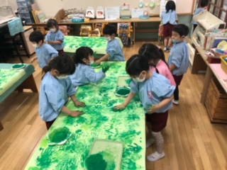 手に絵の具をつけて、手形をギュッギュギュ!「たのしいー」「もっとやろう」と夢中でつくっていました。「チョウチョさん、お花畑で遊ぼうね!」これから遊びが広がってきそうです。