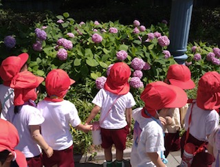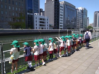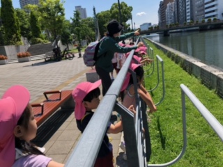 川のほとりに着くと、川面や行きかう船を眺めたり、アジサイの花を見たりと、適時水分補給をしながら、お散歩を楽しみました。みどり組は中之島図書館も見に行きました。