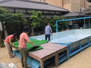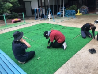 子どもたちの足が汚れないように、周囲に人工芝も敷きつめました。小さいものを一つ一つ組んでいきました。