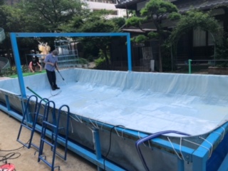 久しぶりにプールを出したので、今年はプール開きに向け、教職員でしっかり洗いました。