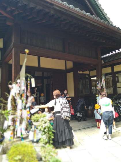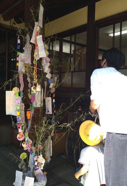 降園時には、保護者の方と一緒に、玄関前に飾った大笹を嬉しそうに眺めたり、自分の短冊や笹飾りを探したりしていました。