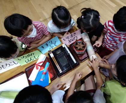 みどり組の子どもたちは「お野菜がたくさん実りますように」「かいたりつくったりすることが上手になりますように」・・と願いながら色々な物を飾ってくれました。幼稚園で収穫した野菜もたくさん並びました。愛珠幼稚園で古くから大切にしている硯や、糸巻きなども飾り、集いが始まりました。