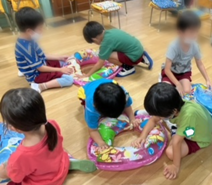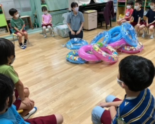 みどり組の子どもたちは、お部屋の掃除だけでなく、プールで使った浮き輪や遊具の片付けもしてくれました。