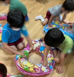 先生から、浮き輪の空気の抜き方を教えてもらい、友達と協力してしっかり空気抜き。