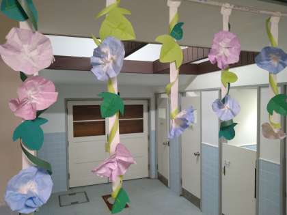 子どもたちがつくったアサガオの暖簾は、風が吹くたびにゆ〜らゆら。かわいい花が揺れています。