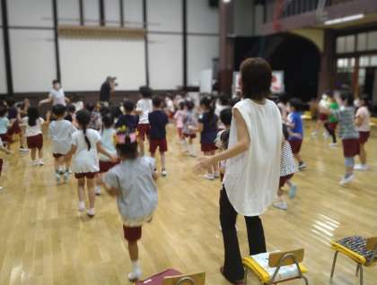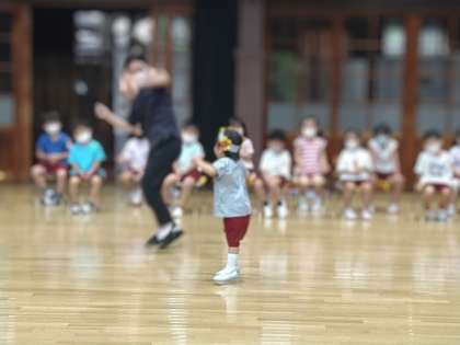誕生児のお友達は、あかぐみさんからもらったヒマワリの花の冠をもらいました。かわいい冠をかぶり、自信をもって好きな遊びを披露したり、みんなと一緒に「エビカニクス」のダンスを楽しんだりしいました。