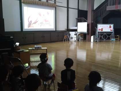 先生からのプレゼントは、ザリガニの絵本の紹介でした。大きく写ったザリガニの映像にくぎづけの子どもたちでした。幼稚園で育てているザリガニに、ますます興味をもちそうです。