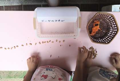 いくつあるのかなぁ・・? 種にも興味をもち、並べたり、数えたりしています。