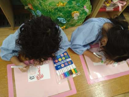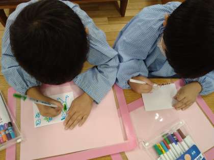 いろいろな刺激を受け、楽しいな!がんばるぞ!と気持ちが高まり、感じたり、イメージしたりしていることを紙いっぱいに丁寧にかいていました。かいた絵は、運動会のプログラムの表紙になる予定です。