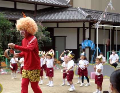かみなりの子ども、かみなりちゃんになりきって、雲の上でたくさん遊びました。途中で遊びに来た大きな「かみなりどん」との仲良しダンスもかわいかったです。
