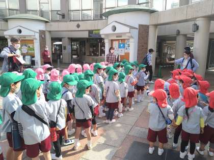さぁ出発!!みどり組は、初めて電車に乗るあか組を優しくサポートし、もも組は自分たちで頑張って歩きました。