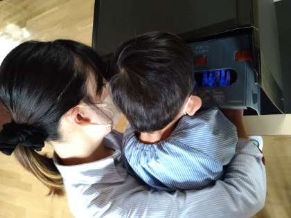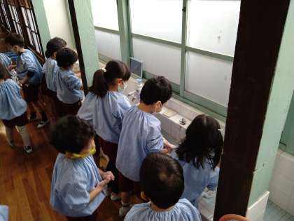 すると・・「あれ、指が光ってる」「きれいに洗ったのにな」と、洗い残しの箇所や多少を見て驚いていました。すぐに光ったところを中心に丁寧に洗っていました。昼食前後、遊んだあとなど、いつも以上に丁寧に手洗いをしていました。実際に体験して、丁寧な手洗いの大切さに気付くことができました。