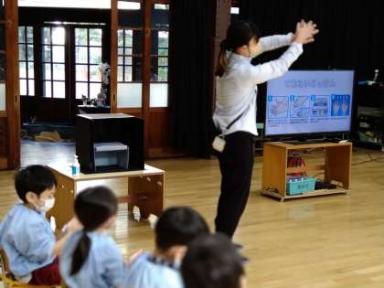みどり組の子どもたちを対象に「てあらいじっけん!(手洗い指導)」をしました。普段からこまめに手を洗い、洗い方も上手なみどり組の子どもたちです。今回専用ローションとブラックライトを使って、洗い残しがないかみんなで「じっけん」をしました。