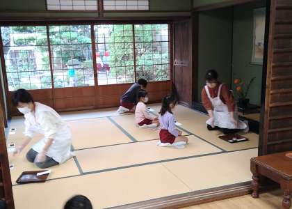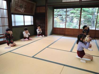 お茶の先生から、座り方や挨拶の仕方なども教わりました。和室でのお茶遊びの雰囲気を感じながら落ち着いてよい態度で体験していました。