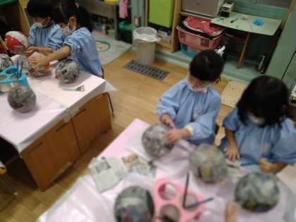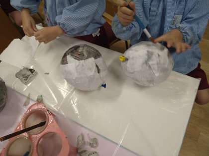 貼り付けているのは風船。風船が見えなくなるまで何度も新聞紙を重ね付けていました。新聞紙の次は和紙です。「うわぁ、風船重たい」「ポトンって落ちちゃうよ」と風船の重さにも驚きです。