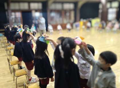 今月の誕生会はたくさんのお友達がみんなからお祝いをしてもらいました。あか組の子どもたちが、折り紙で作ったかわいいドングリの冠をプレゼントしてくれました。