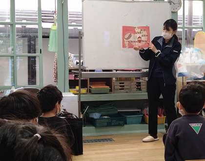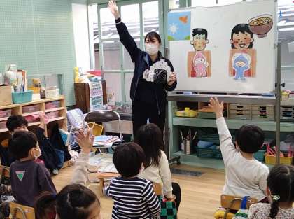 11月16日、中央区より、4歳児訪問事業として保健師さんが来園し、もも組の子どもたちに健康生活について、話をしてくださいました。子どもたちは、保健師さんの話に興味津々。「おなかのこびと」の絵本や手作り教材を使って、3つのお約束「早く寝ましょう」、「朝ごはんをしっかり食べましょう」、「おやつはきめられた分だけ食べましょう」を教えていただきました。読んでくださった絵本は1人1冊ずついただきました。3つのお約束、しっかり守れそうです。