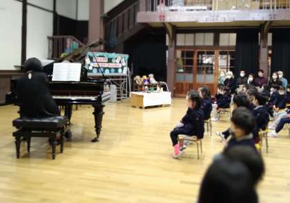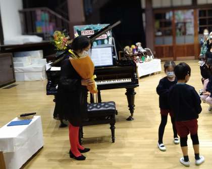 武田先生は本園をご修了され、ドイツでご活躍されている素晴らしいピアニストです。子どもたちは、ピアノが奏でる美しい音色、音の強弱、和音などに聴き入っていました。ピアノを弾く指先を見て思わず、自分も弾いているように指を動かしている子ども、リズムに合わせて体を揺らしている子どももいました。