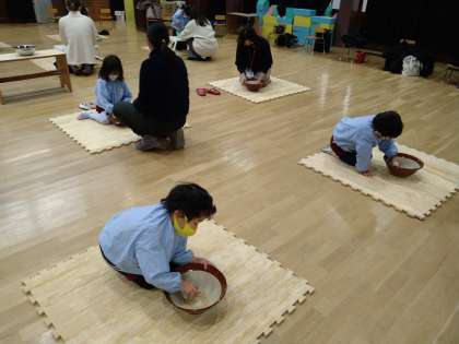 籾すりは、すり鉢に籾を入れて、ボールを回して籾殻と玄米に分けますが、大人でもかなり腕の力を使います。子どもたちも、周囲の保護者や先生たちに励まされ、腕が疲れてきたら、ボールを右、左と回す方向を変えたり、一休みもしながら頑張っていました。