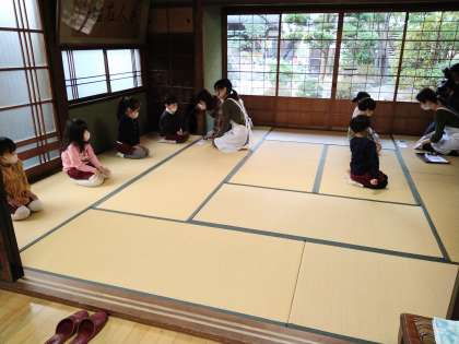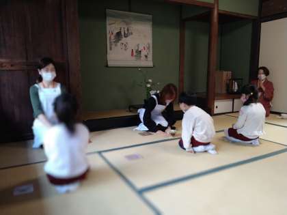 お茶の先生と1月の掛け軸や生け花を眺めたり、和室での座り方や挨拶の仕方、お茶のいただき方など教わりました。初めてのお茶の味はどうだったかな?いつもと違う雰囲気を感じながら楽しく体験できました。