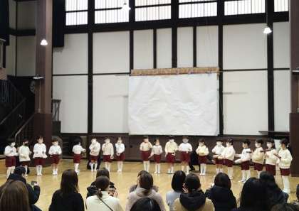 歌「ホ!ホ!ホ!」と楽器遊び「さんぽ」です。ホ!ホ!ホ!ホの歌詞は、弾むように歌い方を工夫していました。明るく元気にになる歌に見ている方もパワーをもらいました。楽器遊びでは、ピアノと友達の演奏する楽器の音をよく聴いて、バッテリー奏にも挑戦!!リズムを感じて演奏していました。