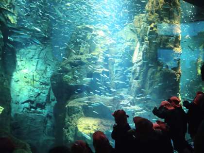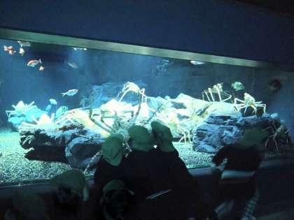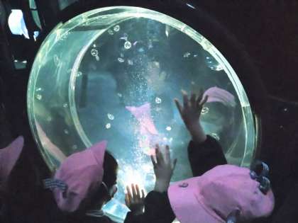 イワシの大群やタカアシガニ、かわいいクラゲたちもいました。珍しい色の魚やアザラシにペンギン・・どの水槽の様子にも目をまるくして見入っていました。