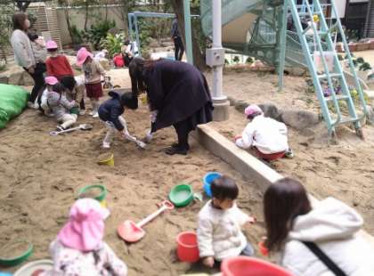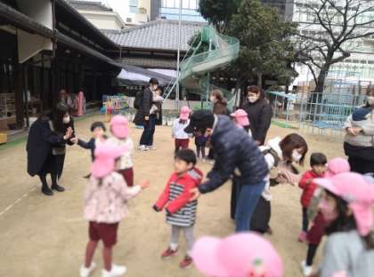 小さいお友達は、優しい歌声と初めて聴く楽器の演奏に興味をもち、静かに聴いていました。園庭では一緒に好きな遊びやダンスを楽しみました。「また来てね!」とお兄さんお姉さんが声をかけると、小さいお友達もバイバイと手を振ってくれました。また来てくださいね。