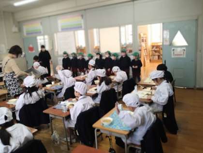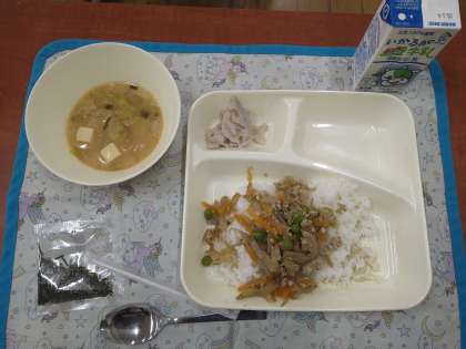 この日の主食は鳥肉とゴボウのごはんでした。レンコンの副菜、味噌汁もありました。栄養満点、美味しそうないい匂いがしていました。給食が待ち遠しいですね。