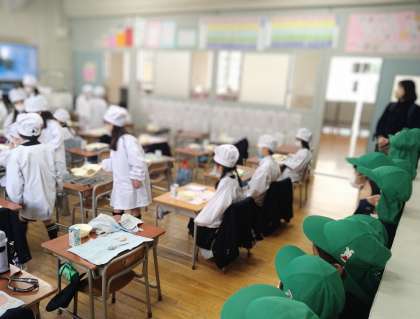 「大きなお皿や・・」「おかわりできるんだって」と初めて見る給食の様子に興味津々。「給食にカレーもありますか?」と小学校の先生に自分の好きな食べ物の質問をする子どももいました。ありますよ!と教えてもらってにっこりでした。